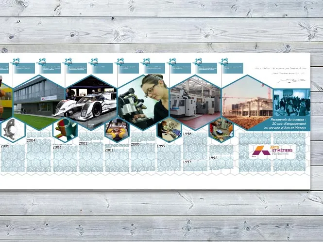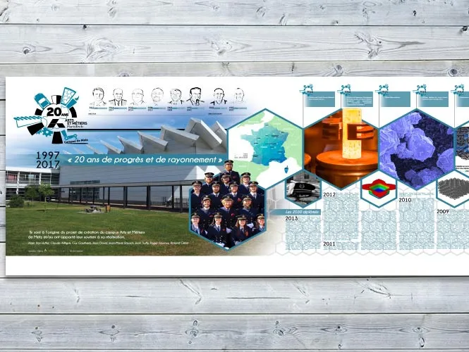 Une frise historique grand format retraçant l’évolution du campus messin à travers ses promotions et ses moments marquants. Pour ce projet, notre équipe a travaillé à partir de photographies d’époque, numérisées puis retravaillées afin de s’adapter parfaitement au format final.